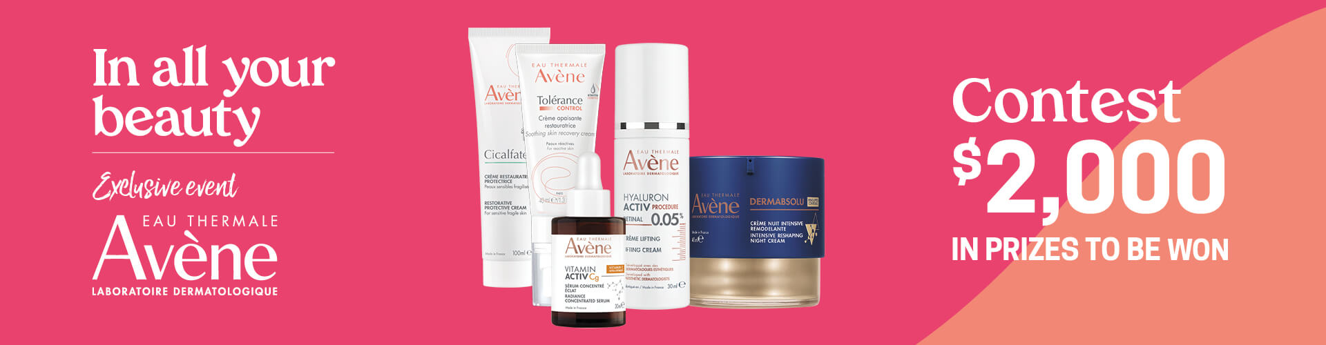 From April 23rd to May 6th, 2026 get a chance to win one of two (2) gift sets valued at $1,000 each! Each set includes a selection of Avène products valued at $500 and a VISA gift card of 500$.