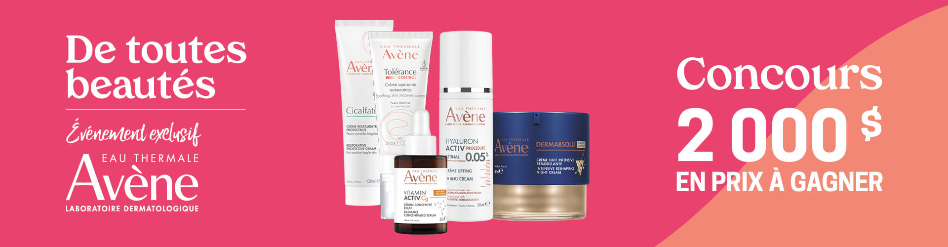 Du 23 avril au 6 mai 2026, courez la chance de gagner l'un des 2 paniers-cadeaux d'une valeur de 1000$ chacun. Chaque panier-cadeau inclus une sélection de produits Avène d’une valeur de 500$ et une carte-cadeau VISA d'une valeur de 500$!